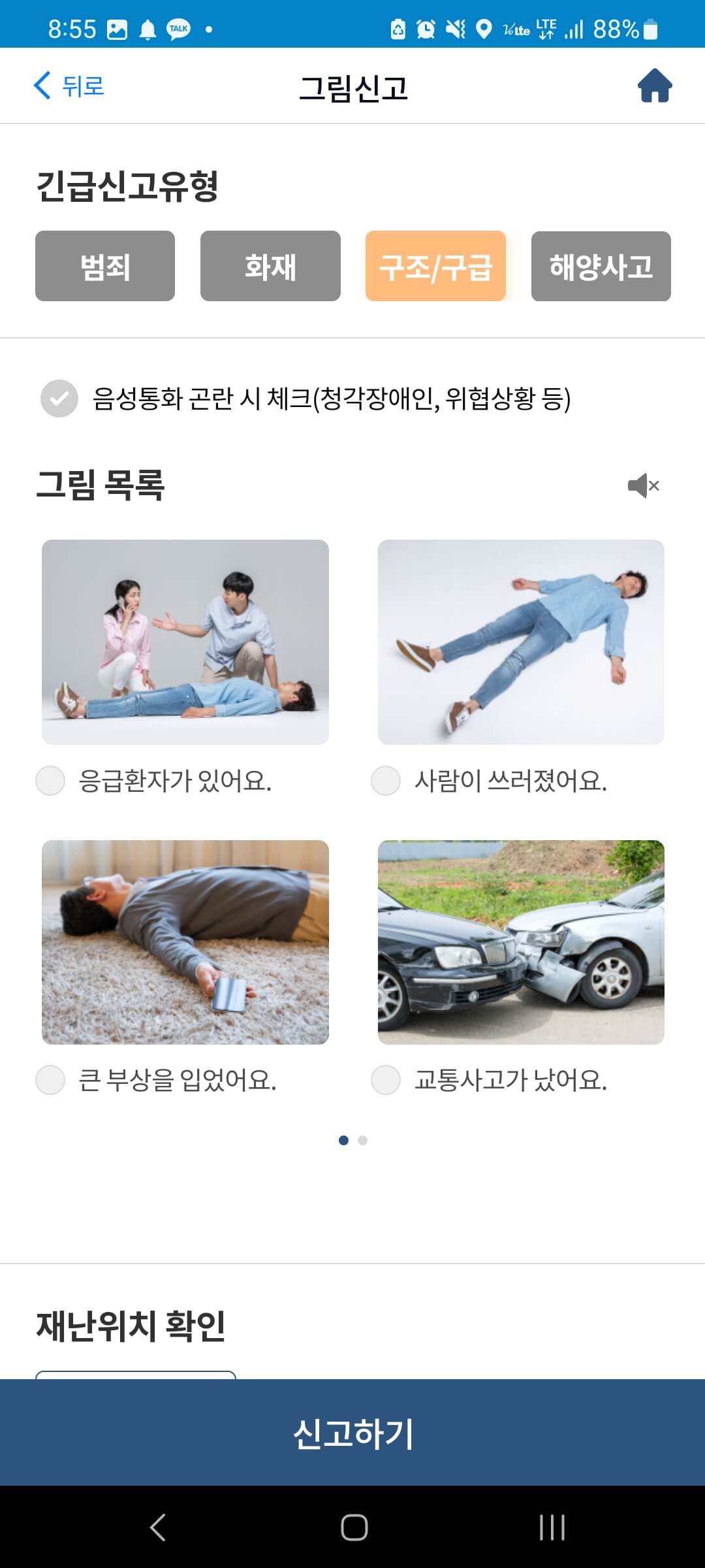 긴급신고 바로에서는 범죄, 화재, 구조/구급, 해양사고 4가지로 분류하고 있습니다. 각각 상황에 따른 그림을 클릭하여 말로 설명하지 않아도 무슨 상황인지 바로 신고할 수 있도록 편리하게 구성되어 있습니다.