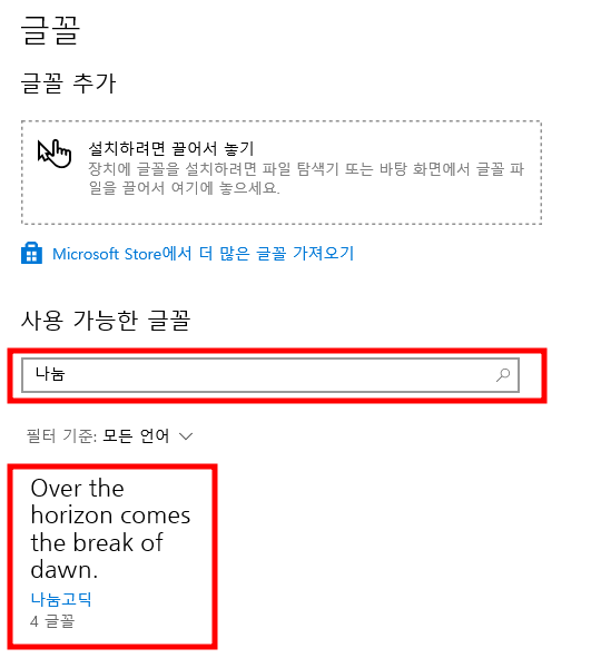 3. 잘 적용이 되었는지 확인해 보겠습니다. 하단에 <사용 가능한 글꼴> 검색창에 <나눔>을 검색해 보면 적용된 것을 확인할 수 있습니다.