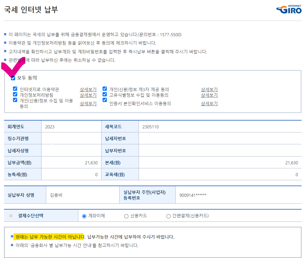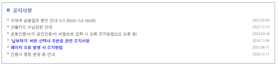 위 결제수단까지 선택하여 진행하신 경우 결제는 금융인증서 또는 공인인증서 2가지만 사용 할 수 있습니다. 7번 단계에서 진행이 멈춘 관계로 따로 화면을 보여드릴 순 없지만 인증서 결제 후 납부는 완료되어 끝나게 됩니다.