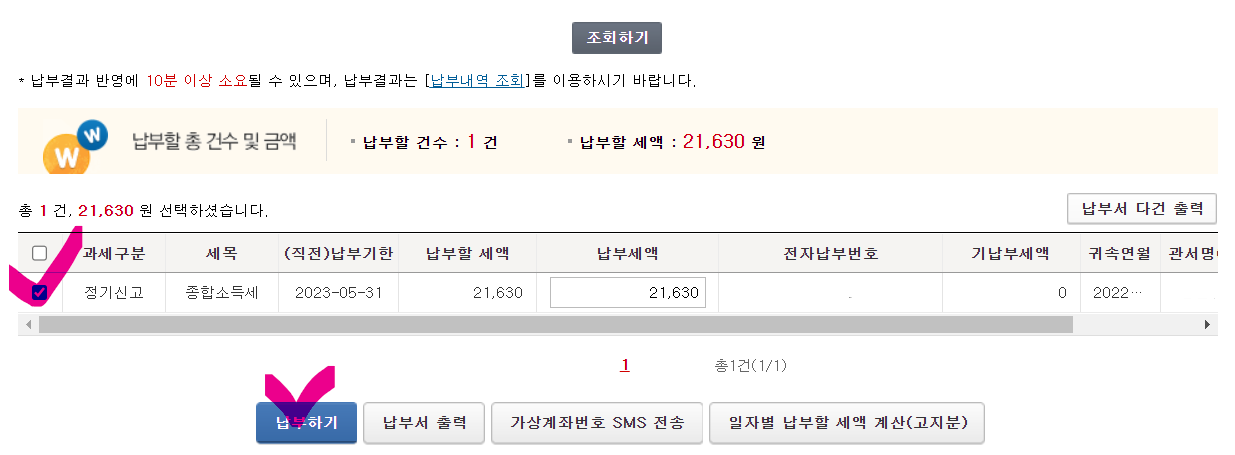 아래 화면에서 체크된 곳을 확인하여 체크하신 후 납부를 클릭합니다.