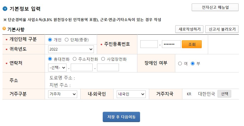 신고 화면에서 붉은색 별표로 표시되어 있는 항목은 필수 입력 사항이므로 틀리지 않게 입력합니다. 개인단체 구분, 귀속년도, 주민등록번호는 자동으로 입력이 되며, 주민번호 옆 조회버튼을 클릭하면 자동으로 나머지 칸의 내용이 채워지며 납부할 금액의 상세 정보를 볼 수 있습니다.
